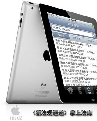 一臺預裝了《新法規(guī)速遞》軟件的蘋果/Apple iPad 2 wifi版16G,是您的掌上法律數(shù)據(jù)庫。