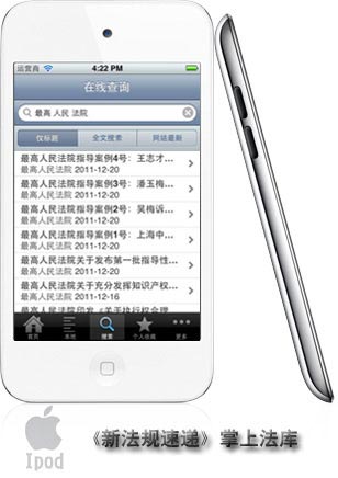 一臺預裝了《新法規(guī)速遞》軟件的蘋果/Apple iPod touch 4,是您的掌上法律數(shù)據(jù)庫。